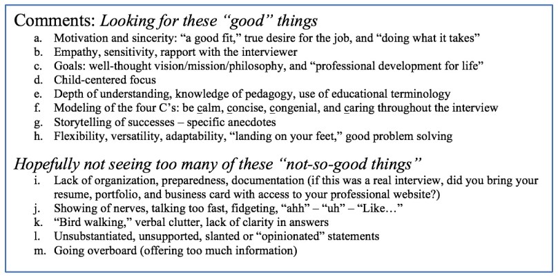 - NAfME: https://nafme.org/interviewing-skills-the-rules-of-the-road/ and https://nafme.org/checklist-intelligent-interviews/