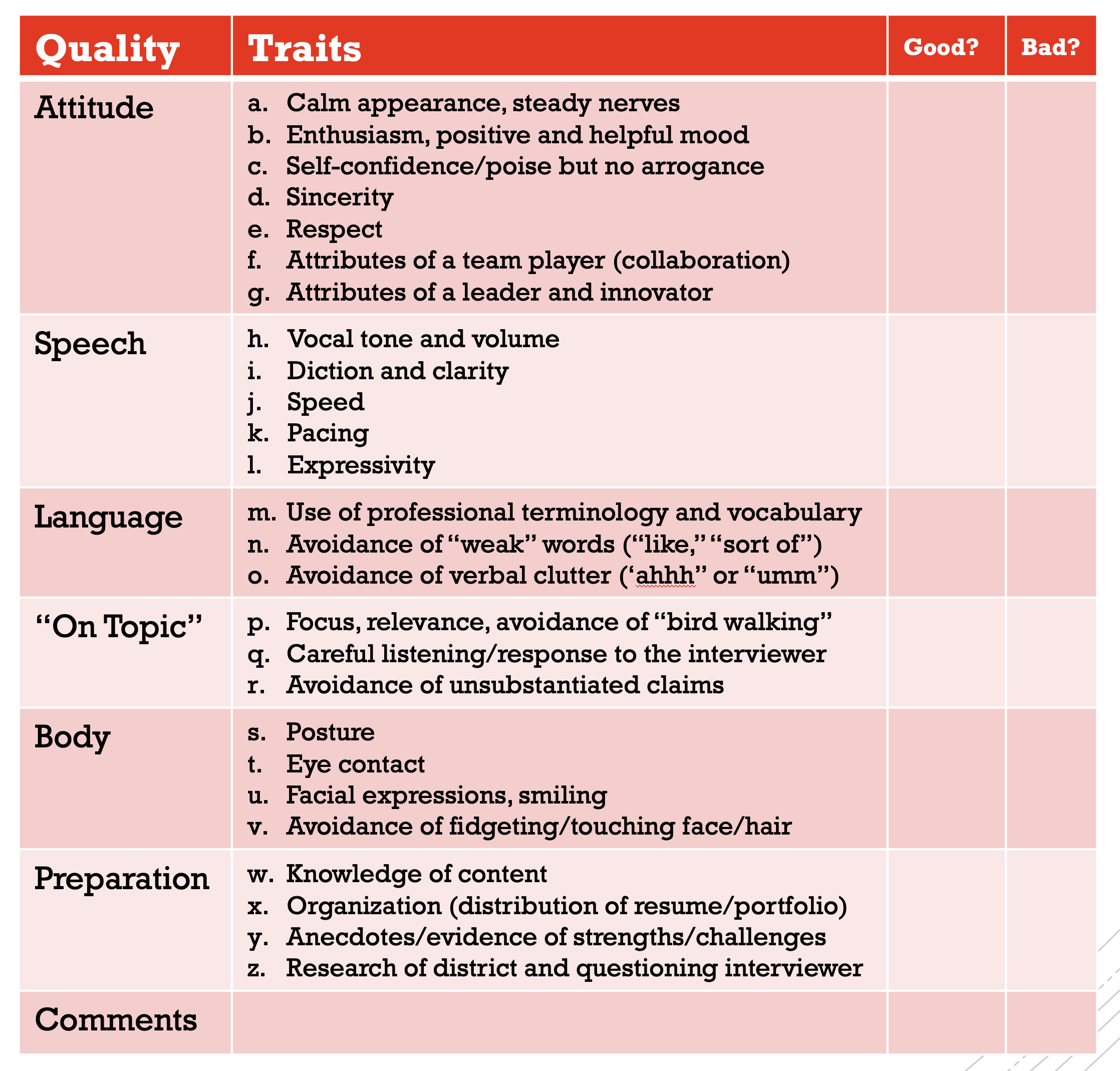 During the mock sessions, here’s an assessment tool you (and those observing your “performance”) can use. For emphasis, place the letter of the criteria under either the “good” or “bad” column.