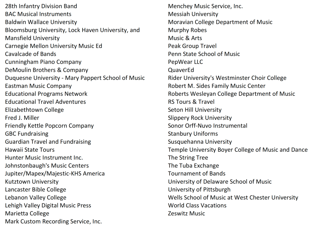 Looking for that new classroom accessory, concert selection, educational travel group, fundraiser, instrument, technology tool, or uniform, or seeking to talk to representatives from music schools? Take time to visit the exhibits. PMEA thanks the continuing support of its PMEA Corporate Sponsors.