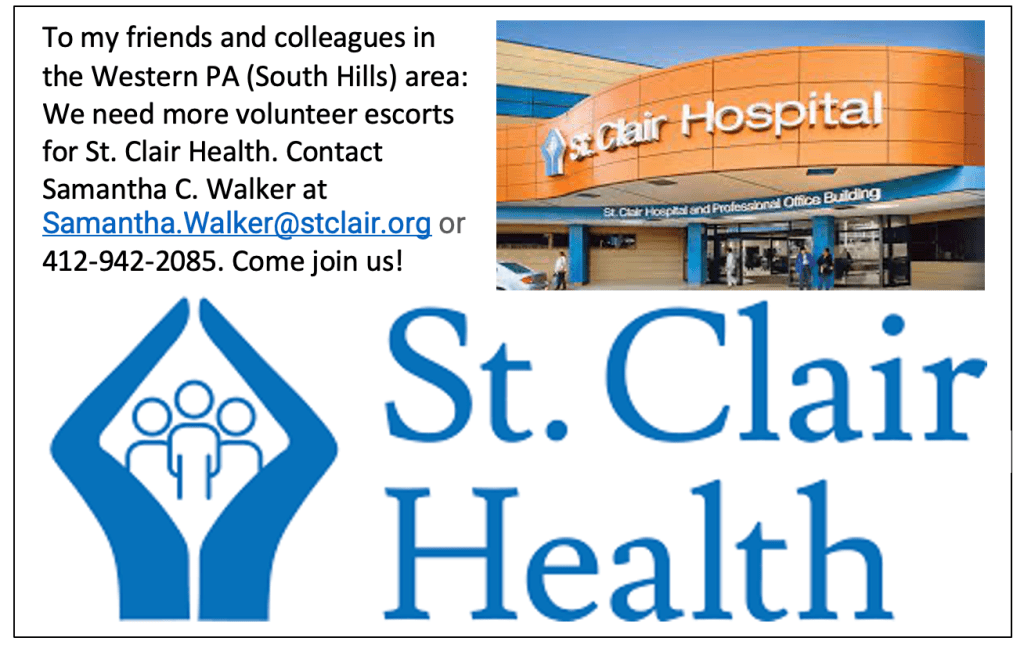 For two days a week, I spend the better part of my day at St. Clair Health in Mt. Lebanon/Scott Township in the South Hills area of Western PA. (If you live in the area, visit their website here.) Although on occasion, I get to visit the Family Birth Center (my favorite) and hospital rooms to help check out patients, most of my shift is assigned to the Dunlap Family Outpatient Center, a new state-of-the-art facility (opened in May 2021 – still has that “new car” smell) for “in and out” procedures. It would not be an exaggeration that I escort as many as 50 individuals per day undergoing outpatient surgeries, endoscopies, colonoscopies, or other diagnostic testing, along with an equal number of family members to/from the treatment rooms. On a given Thursday or Friday, I can check my Apple Watch and iPhone digital health monitors and find I take as many 17,000 steps!