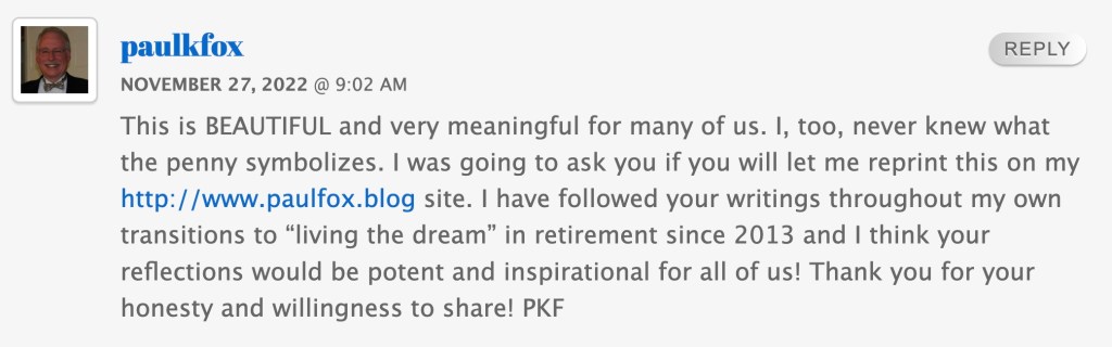 Though I’ve had fits of grief, I’ve also felt immense joy when contemplating my future. During the last year, I deliberately divested myself of anything which smacked of negativity in my life. I decluttered the house paring my personal belongings. I feel washed clean, ready for a new start. Martin would want that for me. A friend asked if I thought Martin’s spirit left the penny. I would like to think so. I may never know who left the penny in my mailbox, but it is now my talisman for fresh beginnings, rebirth, a reawakening of my life’s potential. And a second chance at the retirement we dreamed of.