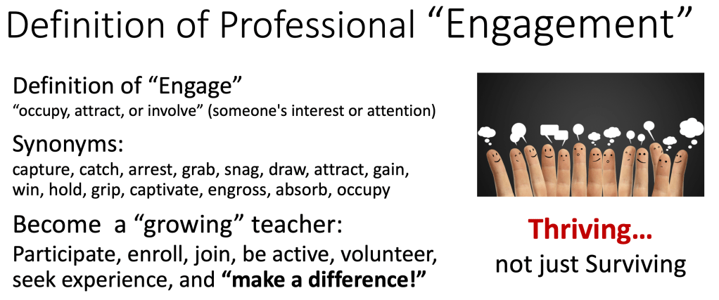 To help “nail down” a few related definitions critical to personal growth and career development in our profession, especially “engagement,” “professionalism,” “collaboration,” and “networking,” please take a little time to travel and consume the following archived blog postings.