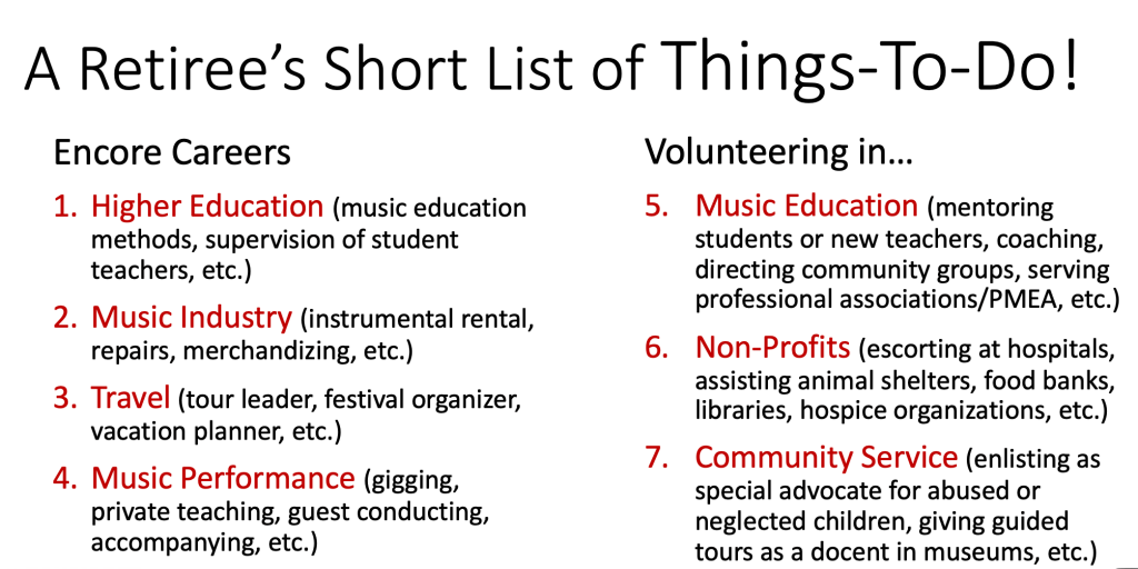 • It’s completely different from anything you’re doing right now. (Music educators have a variety of skill sets that they will likely retain in future part/full-time employment or volunteer work. They can advance their personal artistry in the singing or playing an instrument, accept solo “gigs” or perform in community or professional ensembles. They can teach privately, direct church or community bands, orchestras, choirs or jazz groups, coach sectionals, compose music or design halftime shows, judge school groups, present workshops, choreograph/direct musicals, serve in college music education programs, etc. The list goes on and on… and is only limited by the retiree’s imagination and interest.)