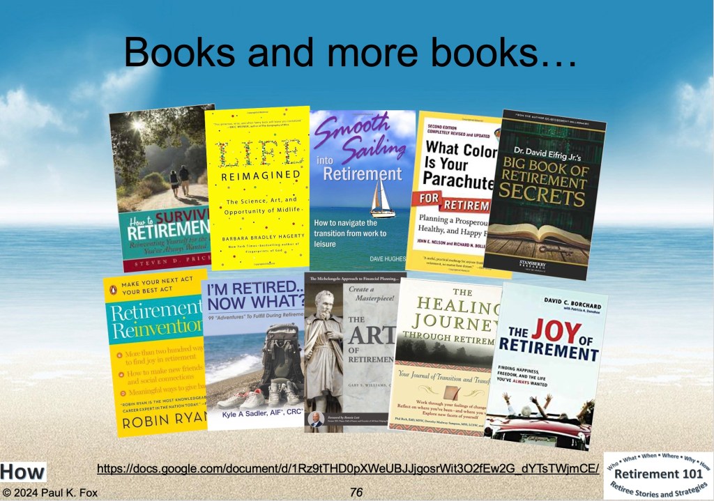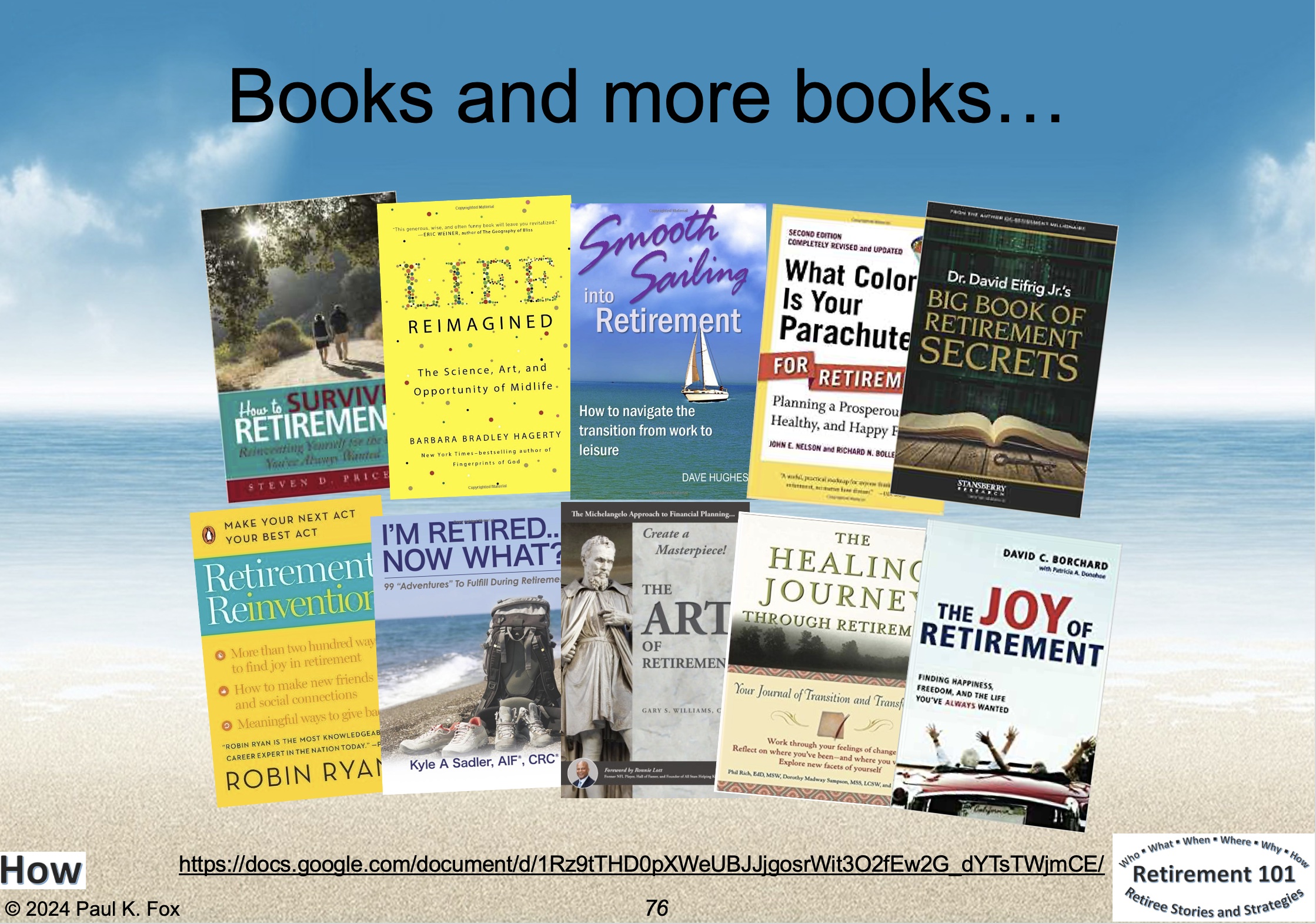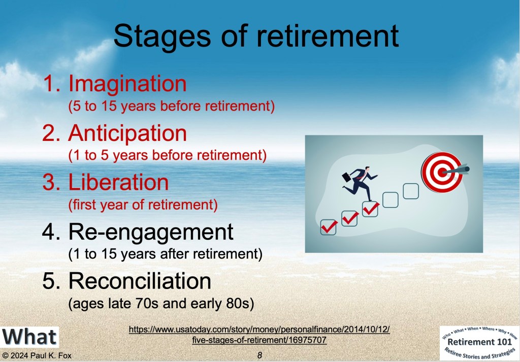 • You retire FROM something. (Nope! You need to retire TO your next phase of life, new goals, pursuits, etc., and not run away from your past. We have often paraphrased the theme of author Ernie Zelinski writings in past paulfox.blogs: Retirees must search for and define the things that your job had provided in the past: 1) Purpose/new life mission, 2) Structure/schedule, and 3) Community/interaction with people.)