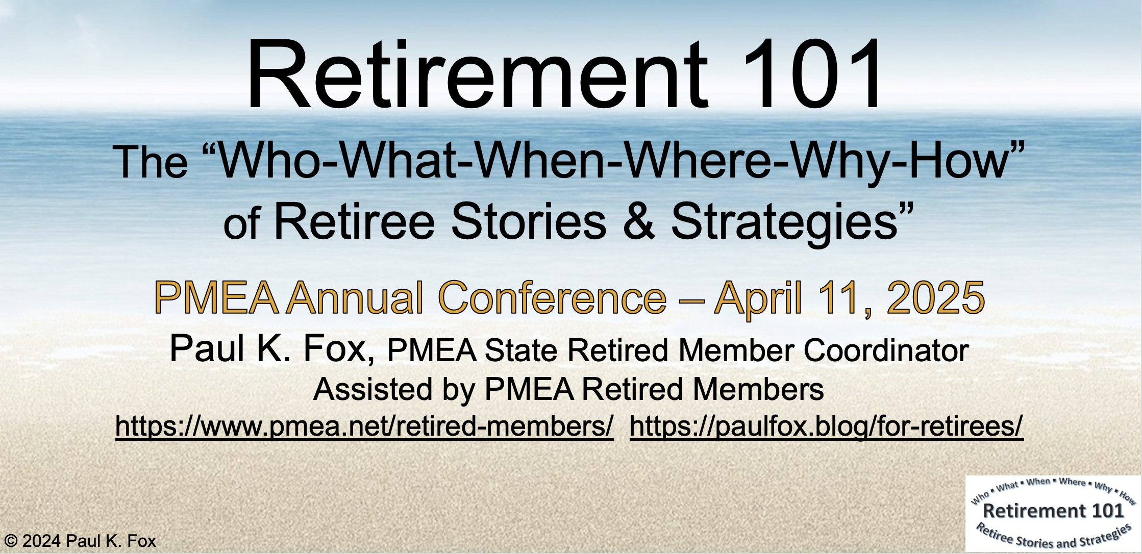 Are you ready to retire over the next 3-5 years? Well, as the PMEA Retired Member Coordinator for ten years (with the help of numerous inspirational music teacher retirees in PMEA), I have spent a lot of time preparing what amounts to be a “mock instructional manual” and other resource materials for fellow PMEA members. These are all posted here on the PMEA website. (This one of the best reasons to maintain your PMEA professional association and pay your dues… We continue to advocate, advise, and assist all PA music educators… from preservice to “living the dream!”)