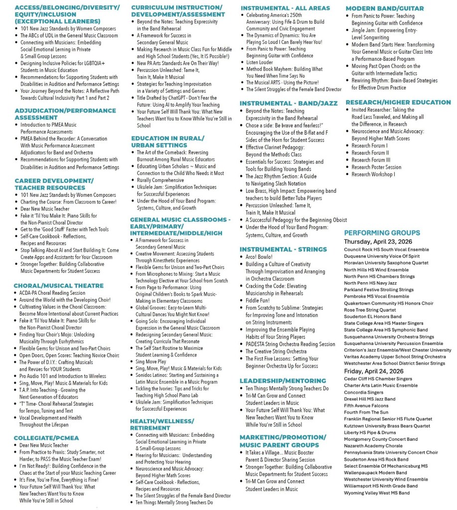 It probably will not come as a surprise to readers of this blog that my favorite professional development venue is the Pennsylvania Music Educators Association Annual Conference… of which I have missed perhaps only three of these “celebrations” over nearly five decades of involvement in music education, all starting with my HS participation in PMEA All-State Band (tuba) and PMEA All-State Orchestra (viola). PMEA Annual Conference is the main event providing “state of the art” keynoters, clinicians, educators, expert innovators, performers, curriculum designers, and supportive vendors, and more than any other source, probably has had the greatest influence on sustaining my growth as a music educator. Like many other “diversified colleagues,” throughout my career I had to go through transitions of teaching new grade levels and content specialties (although orchestra and strings were my “thing,” new job assignments required retooling and fostering renewed skills in music theory, technology, choral, musicals, and even elementary band)… and PMEA’s professional development offerings were always my “go to!”