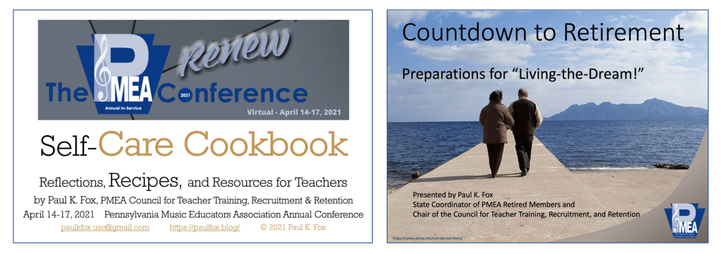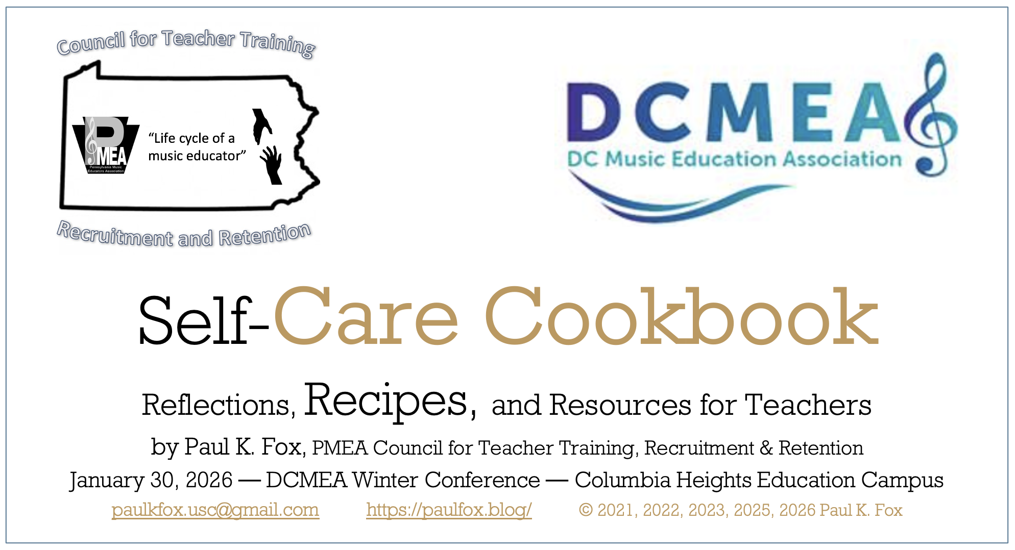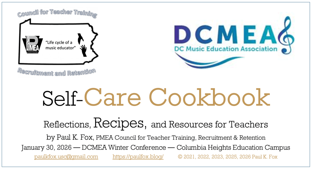 My PDE SAS Institute session will become a “two-for-one” presentation, including the opportunity for school/system leaders, building administrators, and directors of school district professional development to also download my original “Self-Care Cookbook” (1.0) slides, recently updated for the DCMEA Annual State Conference (January 20, 2026). This self-help workshop is geared for educators to “on-their-own” explore strategies, implement use of individualized tools/remedies, and formulate new goals to improve health and wellness. Both sessions hope to cover these key questions: