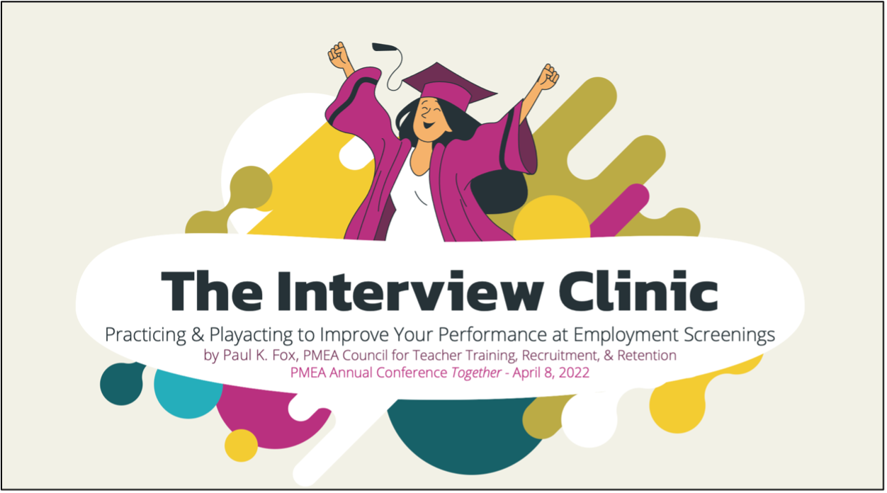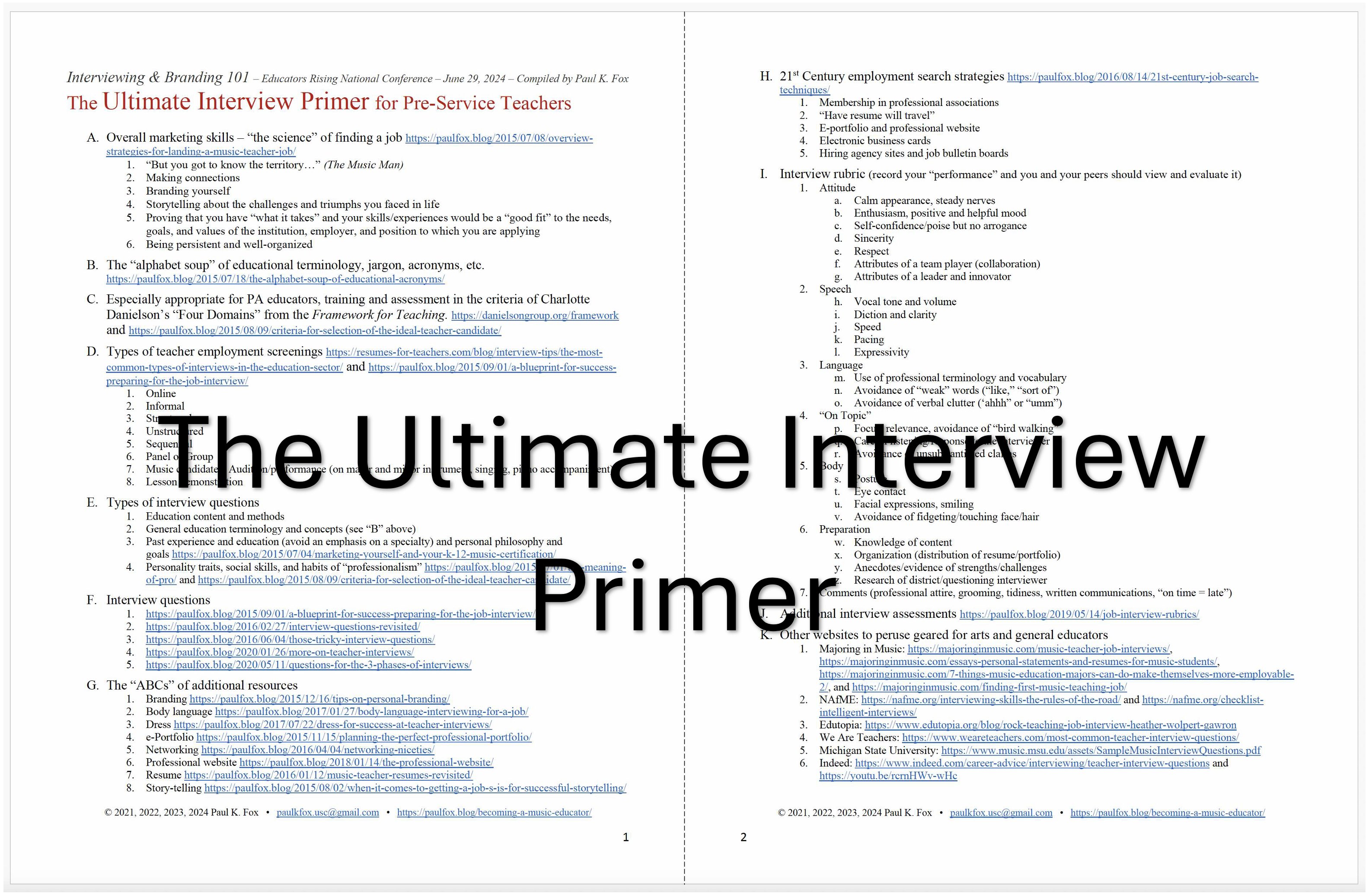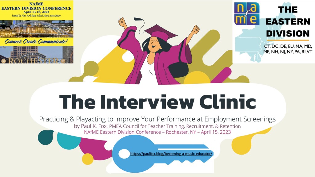 I went as far as updating the most comprehensive and “perfect” PowerPoint for collegiates: Bookends – The Life Cycle of a Successful and Happy Music Educator – portions of which I have presented several times to Professor Jessica Vaughan-Marra’s Seton Hill University music student teachers. This slide handout starts with the material from the first three bullets in the first paragraph above and then adds information about teacher health and wellness, time management, and retirement. We offer Bookends… to preservice music educators in their junior, senior, or graduate years and “rookies” to the profession. I encourage you to download this resource, visit the PCMEA website (click here/scroll down) to read past issues of Collegiate Communique, and the paulfox.blog posts. While you’re at it, acquire your own copy of the Ultimate Interview Primer. Click away before these links become inactive.