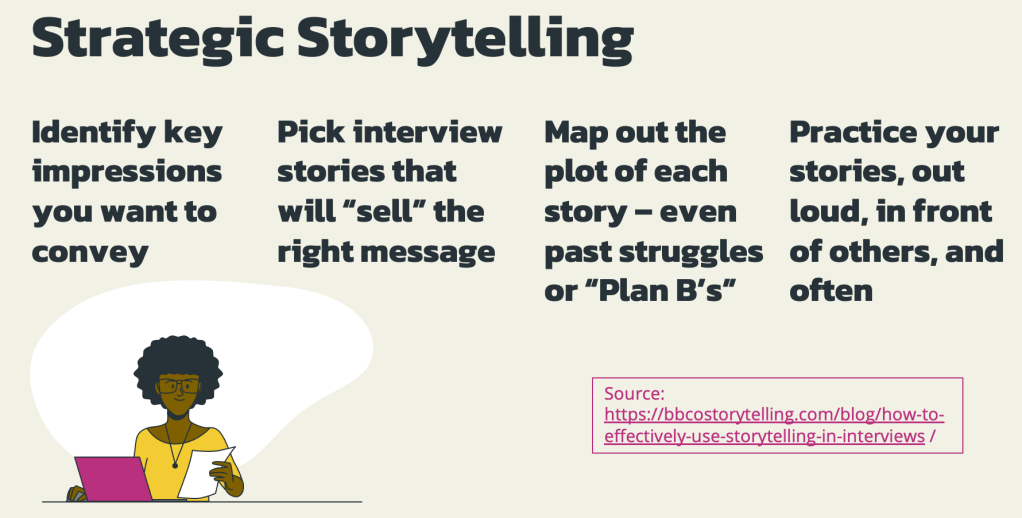 - Identify the impressions you want to “sell” yourself, and practice strategic storytelling.