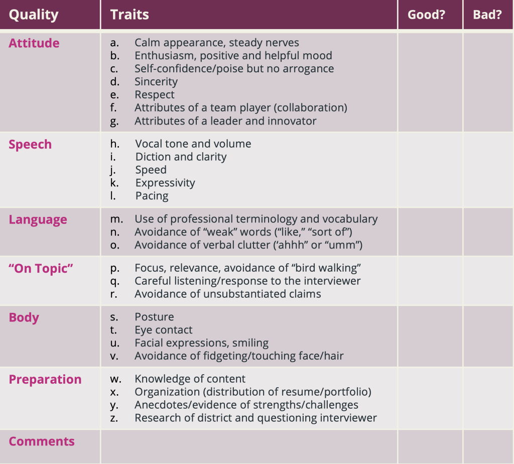- Practice answering interview questions and use a rubric to evaluate your performance. If you can, share all of this with your peers and sponsor mock interview sessions. Record/assess yourself.