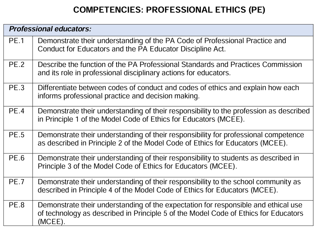 - Read cover-to-cover your PA code of conduct (CPPC) and the Model Code of Ethics for Educators.
