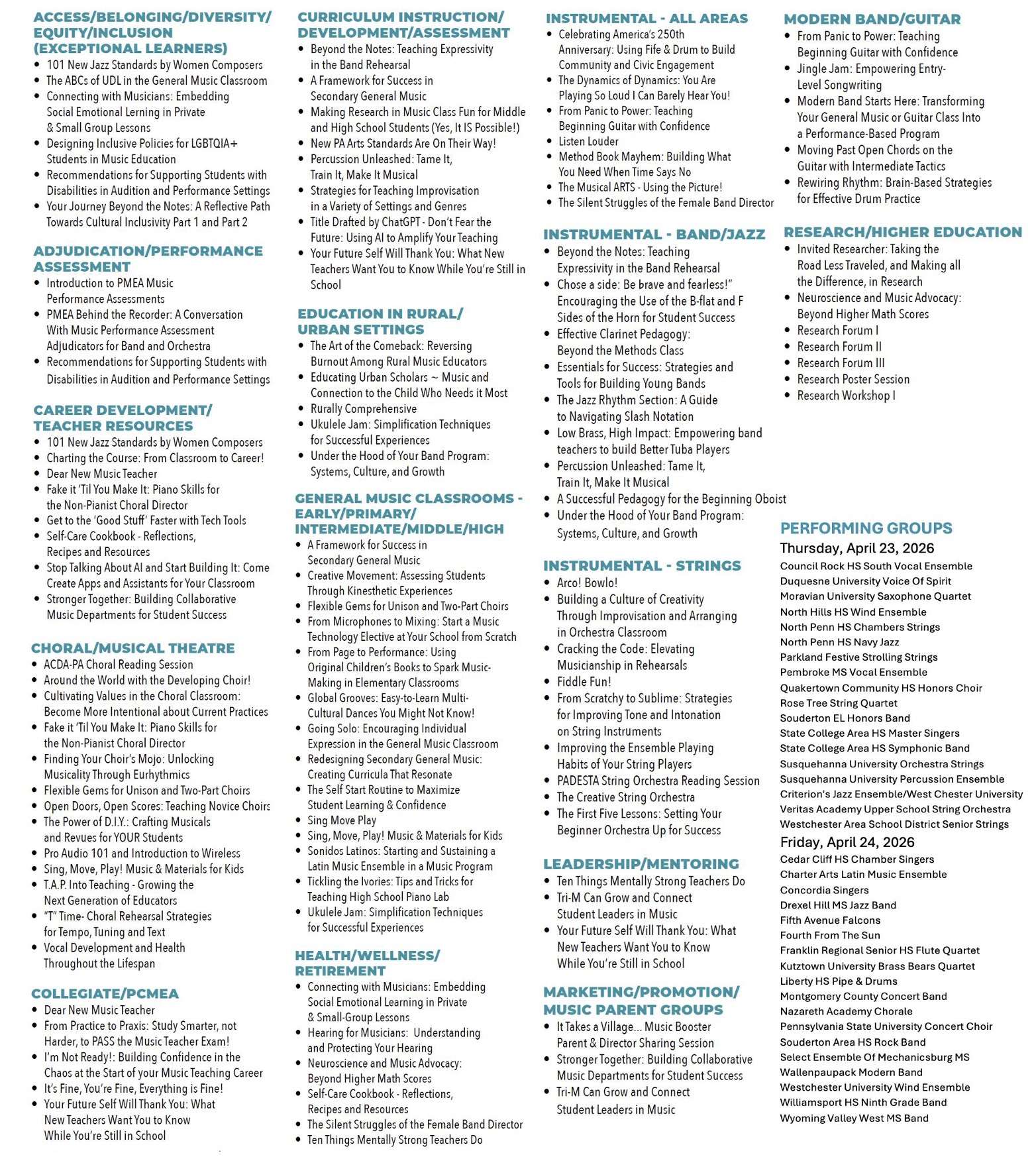 For some of us, it’s a just chance to catch-up with our colleagues, see our friends, and socialize. Others are more focused and take advantage of the near-perfect opportunity to network with other professionals, perhaps seeking new working relationships, partnerships, or even employment. Many are on a look-out for newly published music, that perfect music lesson or teaching strategy, technology tools, fundraisers, advance educational venues, or much-needed equipment to purchase for our ensembles or classrooms. Most come to hear/see the “state of the art” in music education – concerts, demonstrations, keynote speeches, panel discussions, exhibits, research presentations, and workshops. PMEA’s PD Council would likely submit that the primary purpose of a conference is for professional self-improvement… What did Stephen Covey call it? His Habit #7 of “sharpening the saw” – to build a balanced program of self-renewal in the four areas of your life: physical, social/emotional, mental, and spiritual. Covey would insist we embrace “the process that empowers us to move on an upward spiral of growth and change, of continuous improvement.” So, in short, conferences help us “grow” – to revive, re-inspire, re-energize, rejuvenate, re-direct, and re-motivate all of us – pre-service, active in-service, and retired teachers towards making successful new connections, updating our knowledge and skills, and forming new goals. This is how we “keep up” with all the new standards, benchmarks, and cutting-edge advances, and meet the “movers-and-shakers,” visionaries, and leaders in the profession!