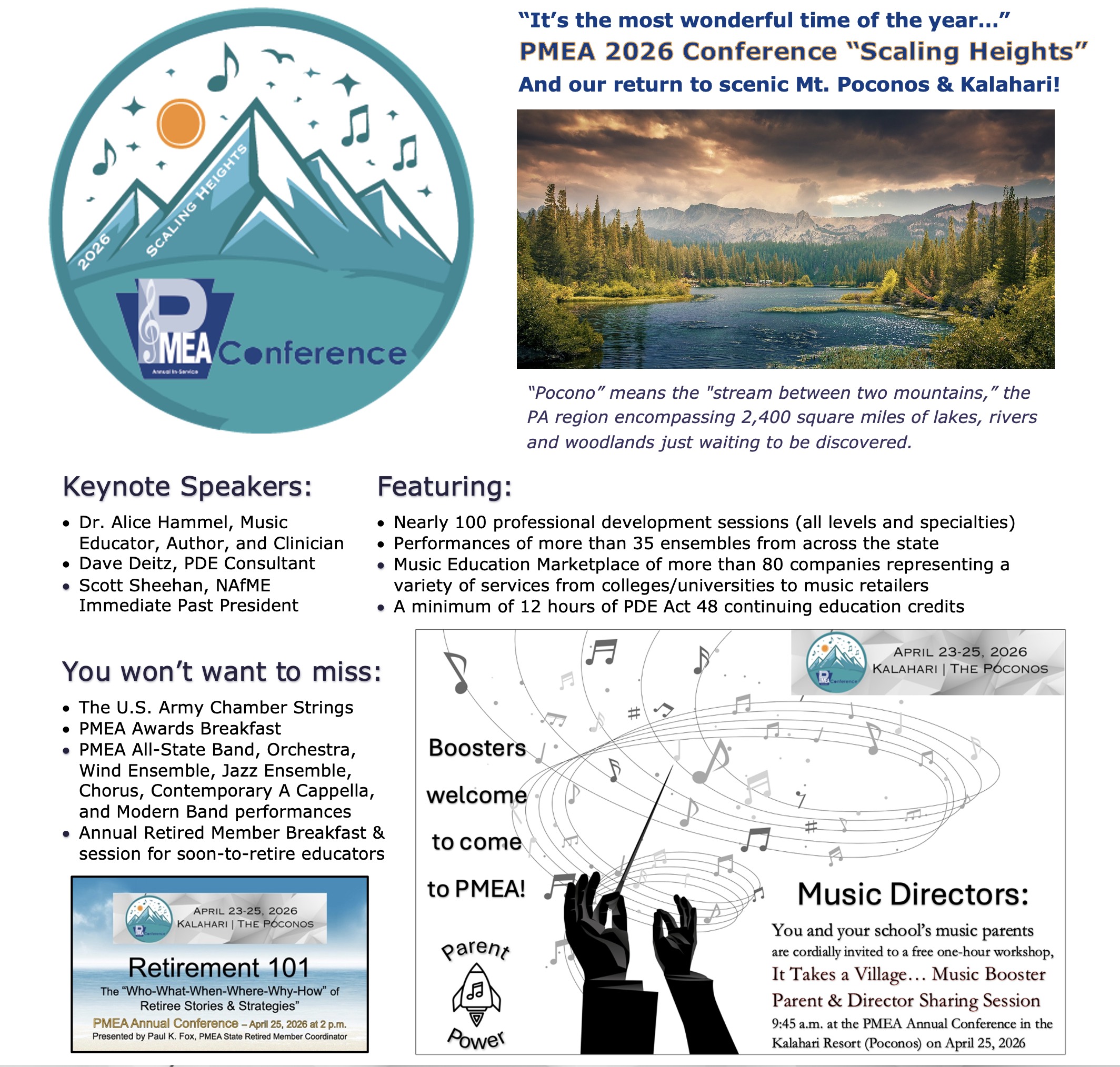 If you live in or near the Commonwealth, you should drop everything today and register for the PMEA Annual Conference at the Kalahari Resort in the Poconos.