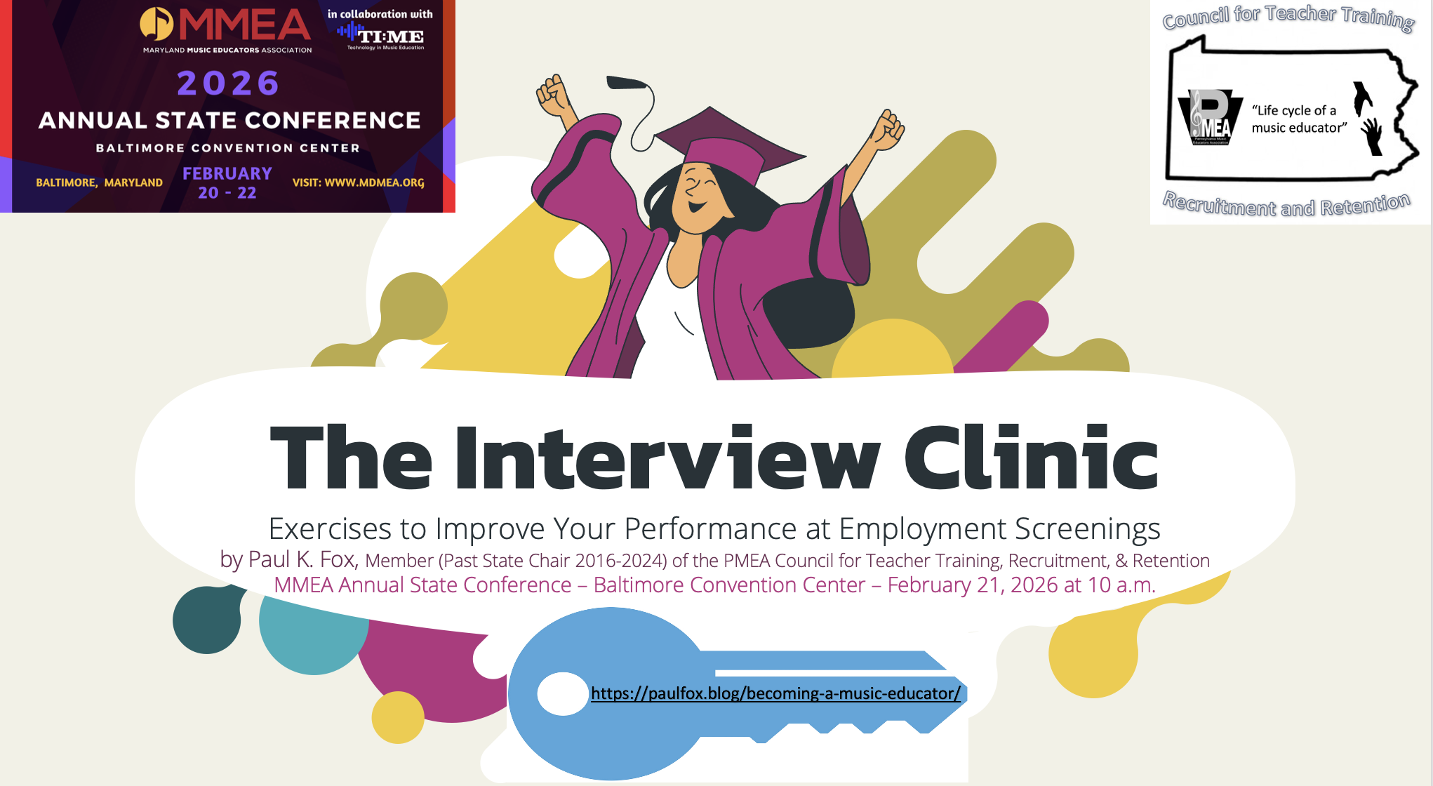 My session The Interview Clinic will be presented on Saturday, February 21 at 10:00 a.m. in Room 325. Geared to the coaching of college music majors, pre-service, unemployed, educators in transition, or those teachers seeking new positions, this workshop will provide hands-on interactive exercises to improve candidate performance at employment screenings.