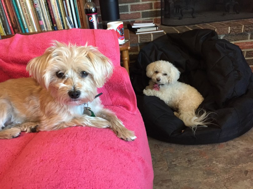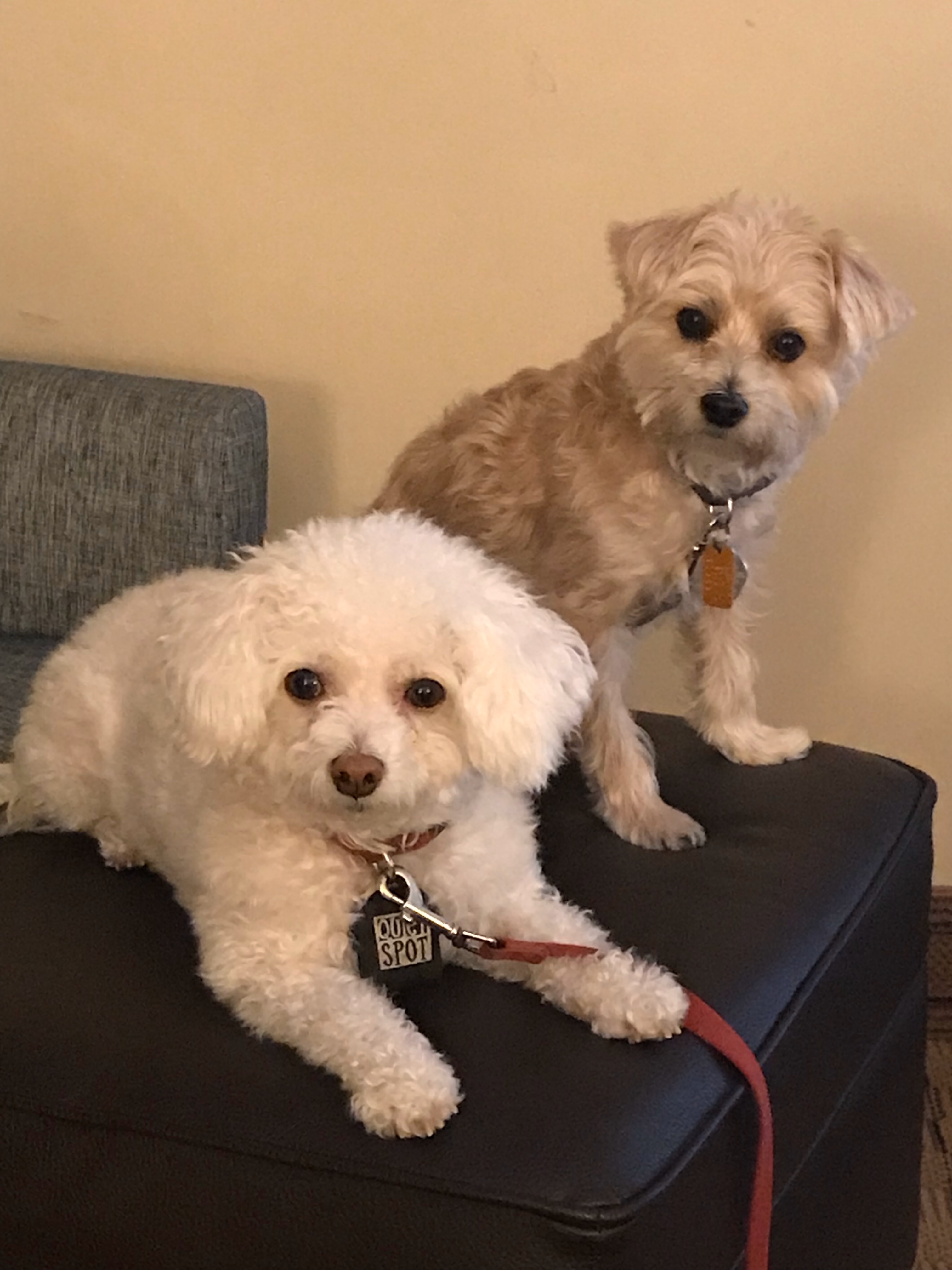 Like grandparents “bragging” about their extended family, dog owners have no compunction to stop and talk to perfect strangers and share their photographs and stories of their pets… especially the wonderful (and sometimes quirky) personality characteristics of their dogs! So, shamelessly, it’s my turn! Here are my two “love and joys” who joined our household literally months after I retired from full-time school music teaching in 2013. Get ready to smile… (and with my best marching band announcer’s voice): “We proudly present ‘Gracie’ (a female Bichon Frise) and ‘Brewster’ (a male Yorkiepoo, Yorkshire Terrier/Poodle mix).”