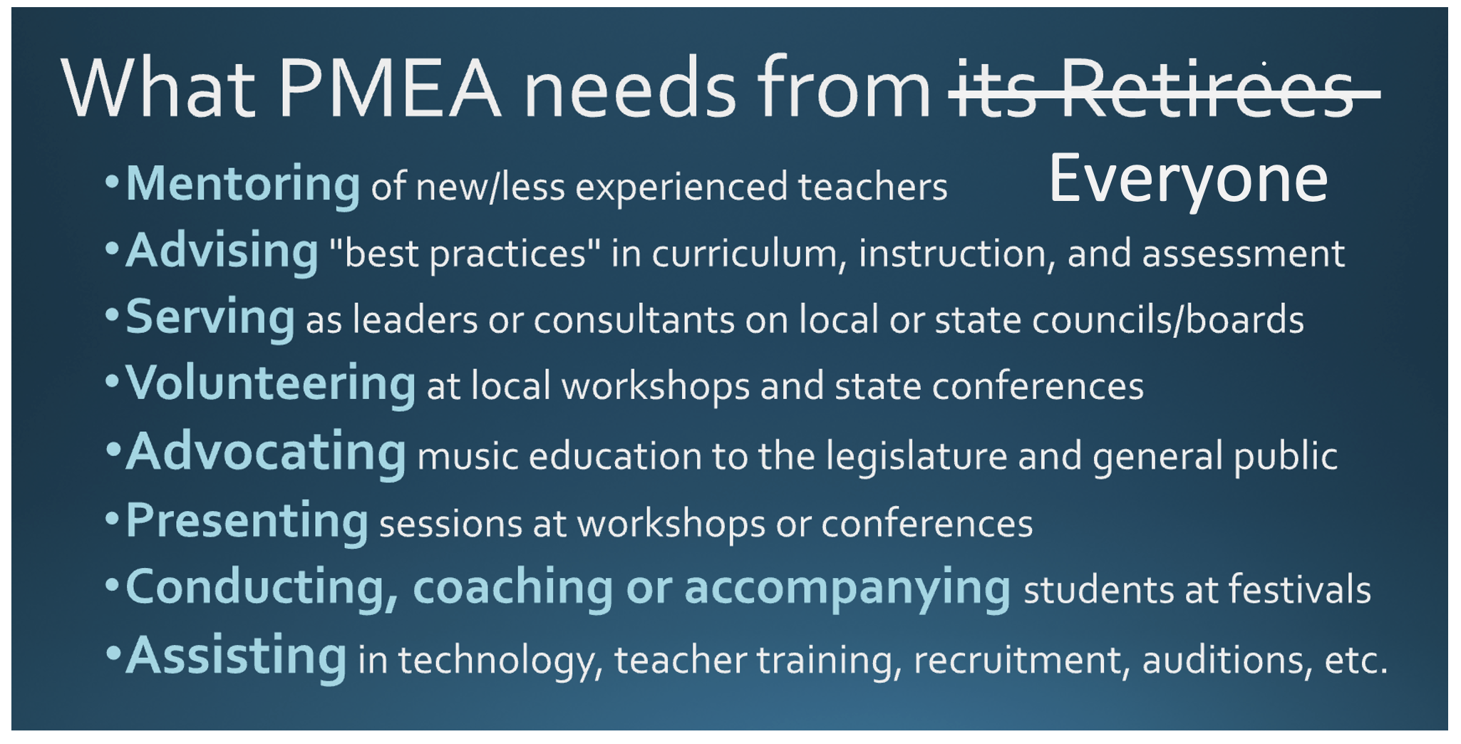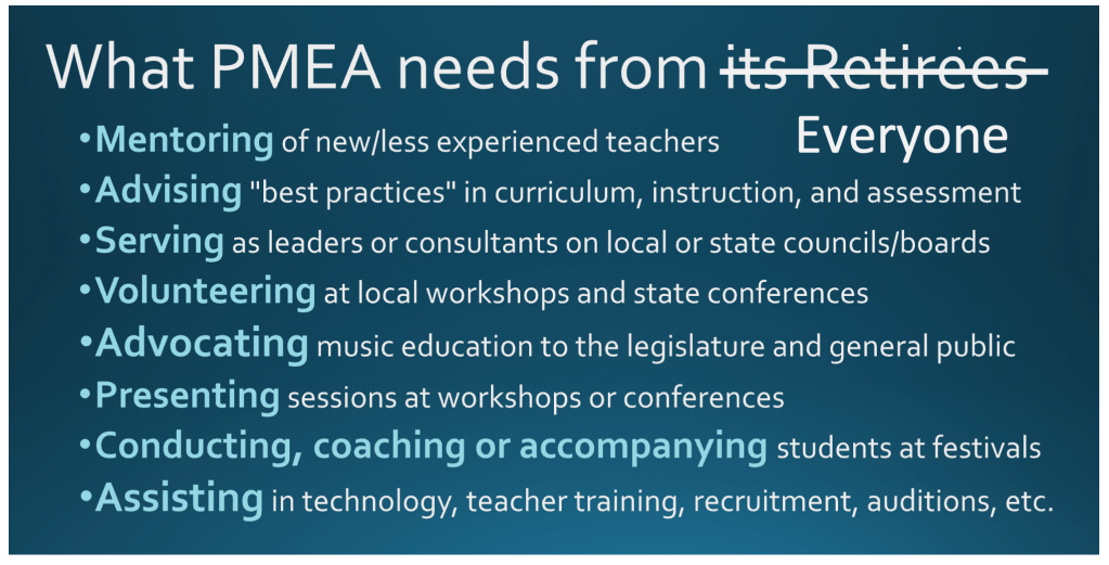 One more piece advice for first-year and recent transfers to music education: Seek out a PMEA mentor and/or a member of the Retired Resource Registry (access from the PMEA Retired Member focus area after you login to your member portal)… both are groups of volunteers willing and able to help “newbies.”