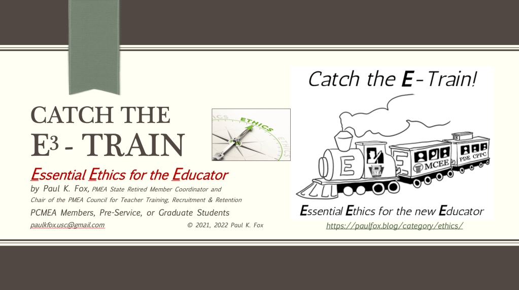 I went as far as updating the most comprehensive and “perfect” PowerPoint for collegiates: Bookends – The Life Cycle of a Successful and Happy Music Educator – portions of which I have presented several times to Professor Jessica Vaughan-Marra’s Seton Hill University music student teachers. This slide handout starts with the material from the first three bullets in the first paragraph above and then adds information about teacher health and wellness, time management, and retirement. We offer Bookends… to preservice music educators in their junior, senior, or graduate years and “rookies” to the profession. I encourage you to download this resource, visit the PCMEA website (click here/scroll down) to read past issues of Collegiate Communique, and the paulfox.blog posts. While you’re at it, acquire your own copy of the Ultimate Interview Primer. Click away before these links become inactive.